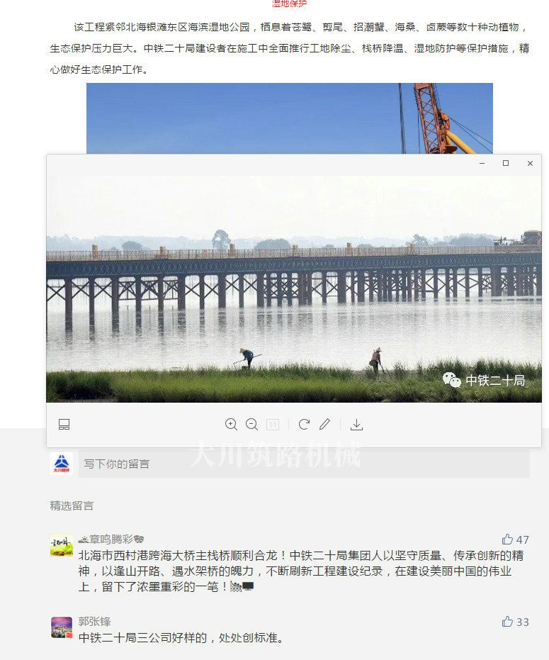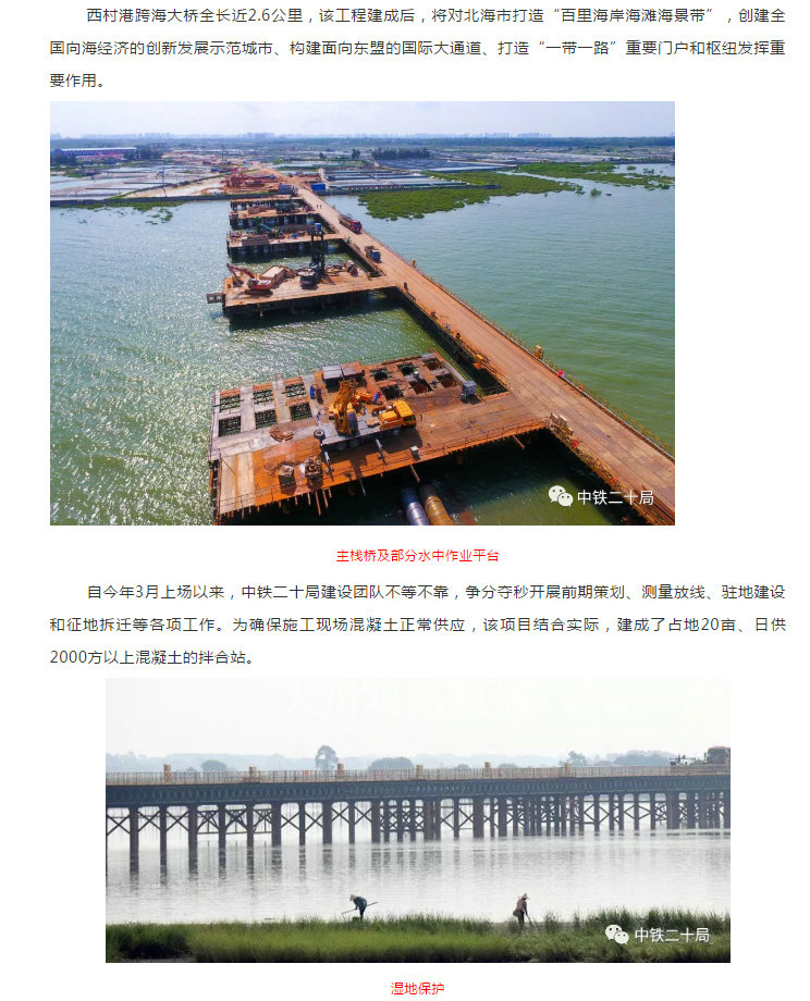 該工程緊鄰北海銀灘東區(qū)海濱濕地公園,棲息著蒼鷺、剪尾、招潮蟹、海桑、鹵蕨等數(shù)十種動(dòng)植物,生態(tài)保護(hù)壓力巨大。中鐵二十局建設(shè)者在施工中全面推行工地除塵、棧橋降溫、濕地防護(hù)等保護(hù)措施,精心做好生態(tài)保護(hù)工作。
